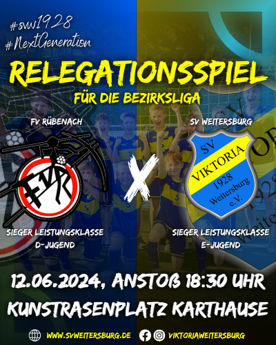 Nach der sensationellen Meisterschaft in der Leistungsklasse kann die E-Jugend des SV Viktoria nun den nächsten Step auf ihrer Reise gehen. Es geht um die Fragen: Spielt in der Saison 2024/25 auch unsere E-Jugend überkreislich? Schafft sie den Sprung in die Bezirksliga? Gegner ist der Meister der D-Jugend-Leistungsklasse, die Jugend des FV Rübenach.