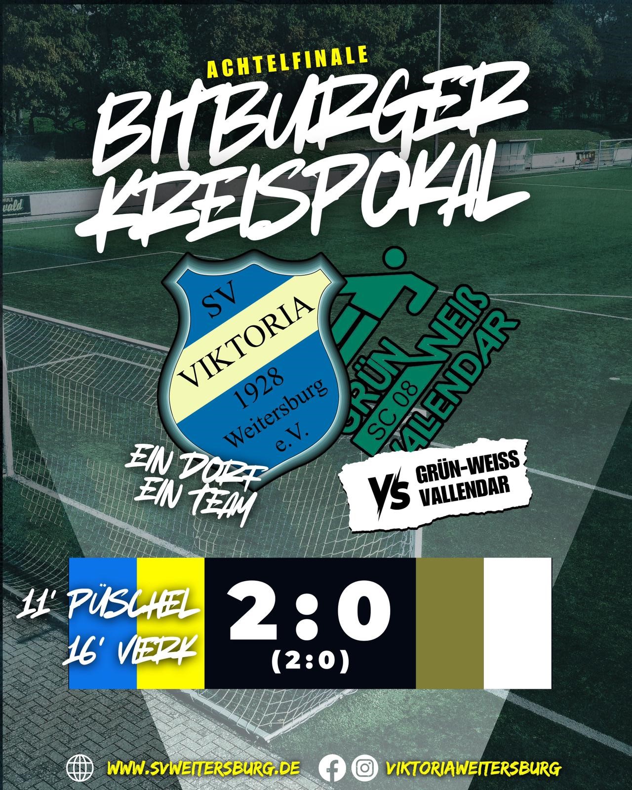 Am gestrigen Mittwochabend sicherte sich Viktoria II unter Flutlicht und in echter Derby-Atmosphäre den Einzug ins Viertelfinale des Bitburger Kreispokals. Mit einem 2:0-Sieg gegen die Gäste aus Vallendar, erzielt durch Tore von Püschel in der 11. und Vierk in der 16. Minute, setzte sich das Team durch.
