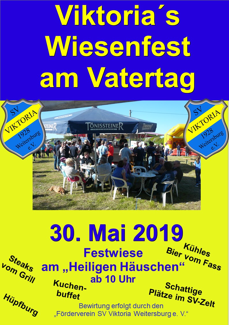 Die Festwiese am Weitersburger Heiligenhäuschen wird wieder vom SV Viktoria am Vatertag mit Zelt, Bierbrunnen und Grill so hergerichtet, dass Sie hier einen gemütlichen Platz zum verweilen vorfinden.