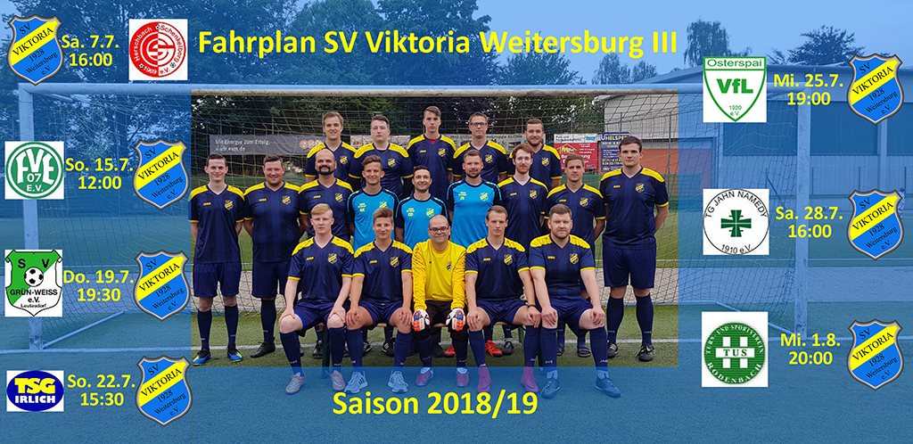Ein anspruchsvolles Auftaktprogramm erwartet die 1. Mannschaft in der neuen Saison. Gegen die Sportfreunde aus Höhr-Grenzhausen startet der SV Viktoria in die neue Saison. Am 19. August empfängt die Felgner-Elf den letztjährigen Tabellendritten um 14.30 Uhr im Weiherstadion. Das 1. Auswärtsspiel findet dann eine Woche später beim Aufsteiger FC Horchheim statt. Anpfiff dieser Partie ist am Freitagabend, 24. August 2018, 19.30 Uhr.