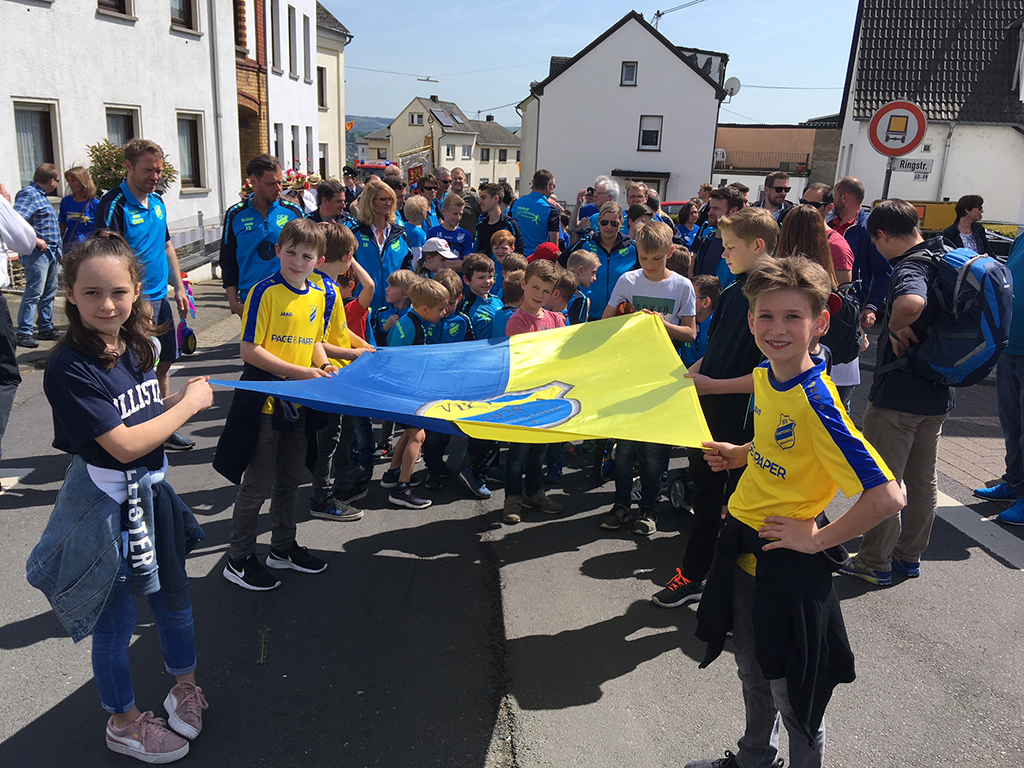 Bei strahlendem Sonnenschein trugen die Jugendpieler die blau-gelbe Fahne stolz durch die Weitersburger Straßen. Begleitet wurden sie von ihren Trainern, einer großen Zahl an Aktiven des Lauftreffs, inaktiven Vereinsmitgliedern und des Vorstandes.