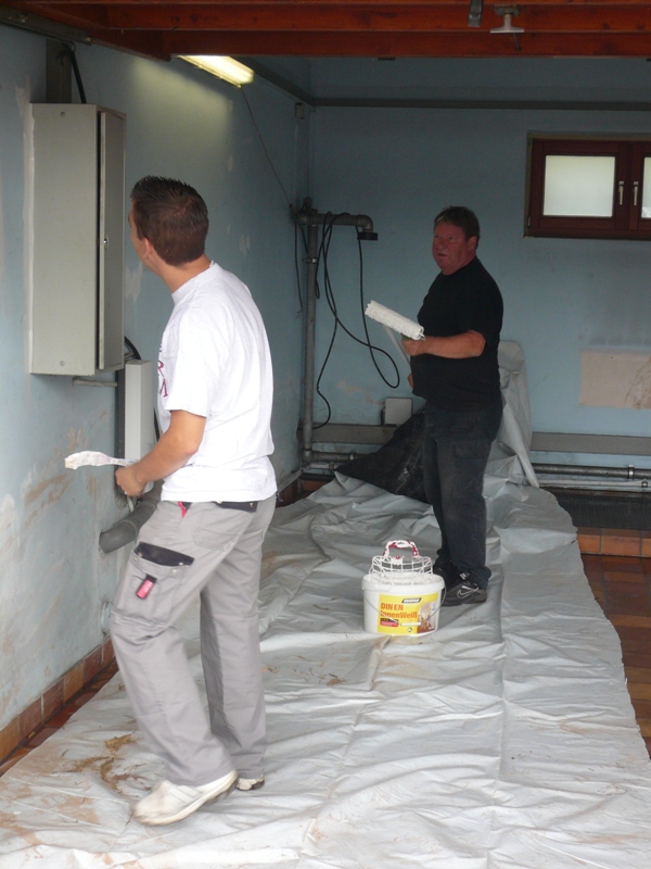 Die Spieler der 1. Mannschaft sorgten afür, dass ihr versandeter Ballraum für den Kunstrasenplatz vorbereitet wurde. Hier war fast schon eine „Kernsanierung“ notwendig. Die übrigen Anwesenden sorgten dafür, dass der Besprechungsraum wieder in strahlendem Weiß schimmert, genauso wie die Doppelgarage.
