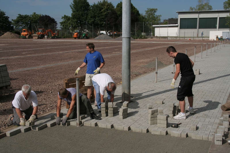Wie in den beiden vergangenen Wochenenden, waren auch am 09.07. wieder zahlreiche SV'ler ohne Ball am Sportplatzgelände sehr aktiv. Die ersten 400 von 1500 qm Pflaster wurden entlang der Stehtribüne verlegt. Sowohl beim
