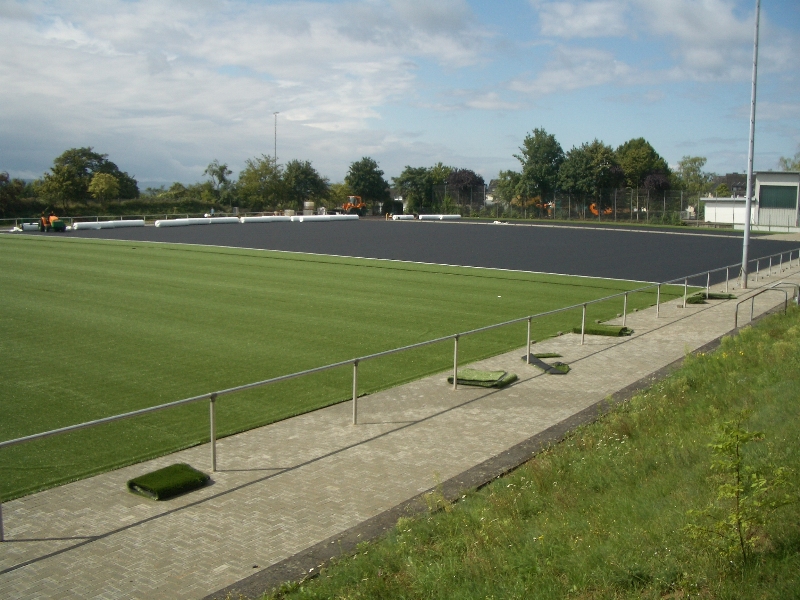 Nachdem an den letzten Wochenenden die Aktiven des SV Viktoria die Pflasterarbeiten so weit es ihnen möglich war zu Ende brachten, waren unter der Woche auch die Arbeiter der beauftragten Firma fleißig. Täglich können die interessierten Zuschauer Baufortschritte verzeichnen, so dass mittlerweile Form und Größe des Sportplatze, des Kleinspielfeldes sowie der Laufbahn sehr gut zu erkennen sind. Seit dieser Woche wird nun im Weiherstadion der eigentliche Kunstrasen verlegt. Nur noch wenige Wochen, dann wird wieder das Leder im Weiherstadion rollen, und das auf einem Belag, von dem viele Fußballer träumen!