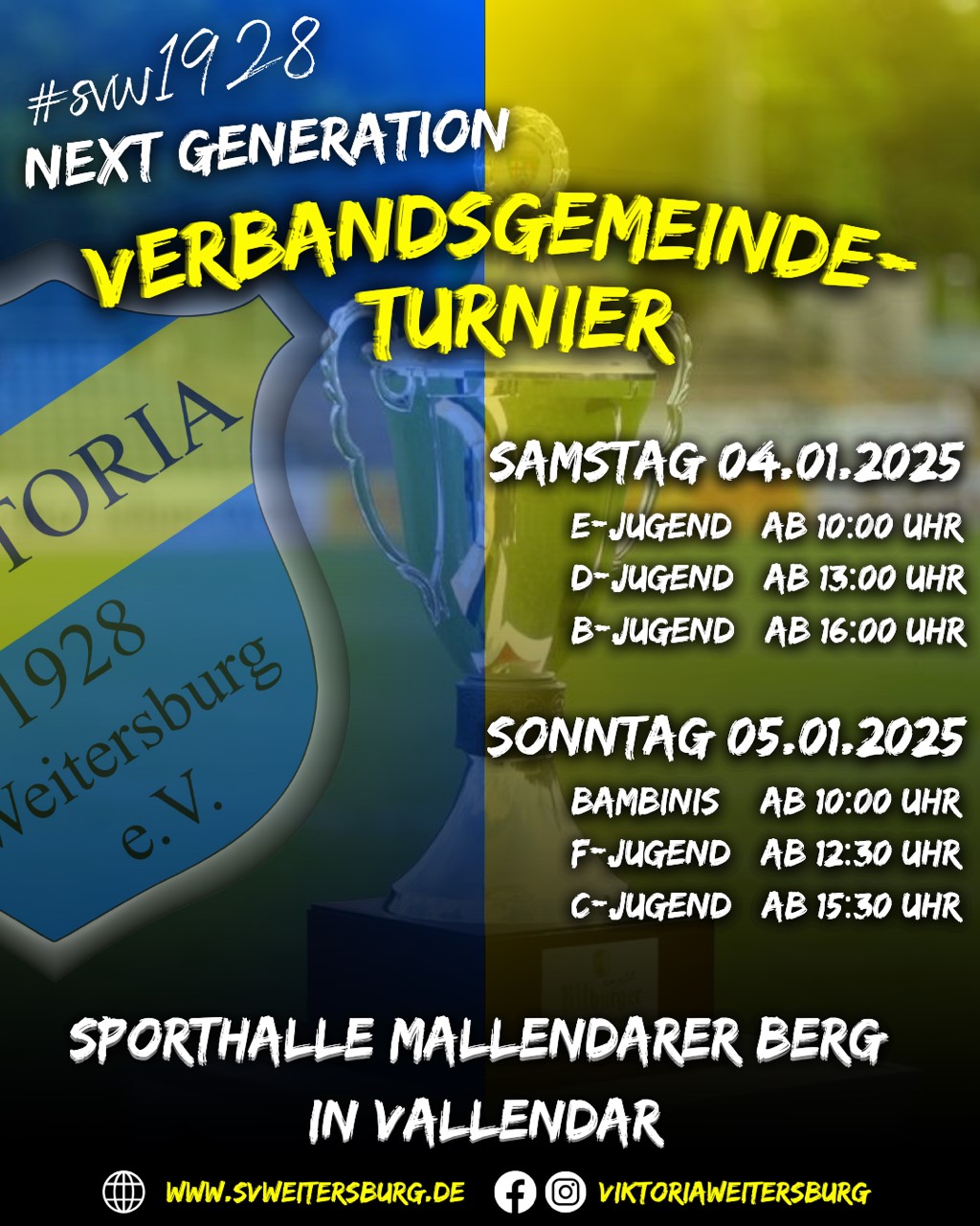 Traditionell startet das neue Jahr mit einem Highlight für unseren Nachwuchs: Am ersten Wochenende des Jahres rollt der Ball wieder beim beliebten Hallenturnier auf dem Mallendarer Berg! Mit großer Vorfreude machen sich unsere Jugendmannschaften – von den Bambinis bis zur C-Jugend – auf den Weg, um sich mit den Teams der Verbandsgemeinde zu messen.